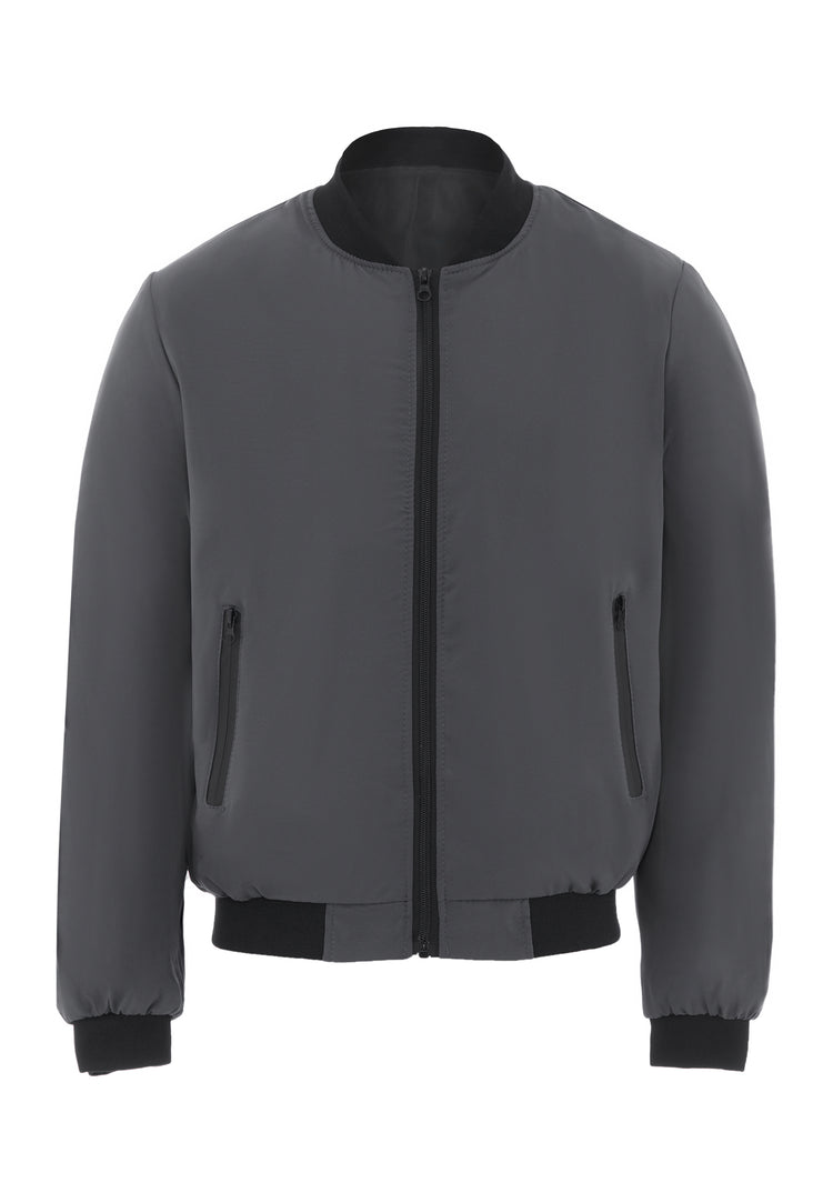 Ta kurtka bomber ma zamek błyskawiczny na całej długości z przodu i stójkę. Elastyczne mankiety na długich rękawach zapewniają dodatkowy komfort, a zapinane na zamek kieszenie w talii i lewym rękawie oferują praktyczne możliwości przechowywania. Prosty krój bez widocznych wzorów i dekoracji nadaje jej elegancki i nowoczesny wygląd - idealny dla każdego, kto szuka minimalistycznej marynarki.